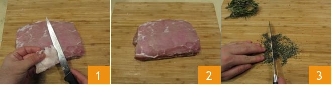 Para preparar el asado de cerdo en porchetta, comienza eliminando los tendones presentes con un cuchillo bien afilado 1. Déjalo deslizar entre la carne y la parte blanca translúcida teniendo cuidado de no cortar también la pulpa 2. Esta operación sirve para eliminar la parte más correosa del trozo de carne. Reserva el trozo de lomo y mientras tanto pica finamente el romero con el cuchillo 3.