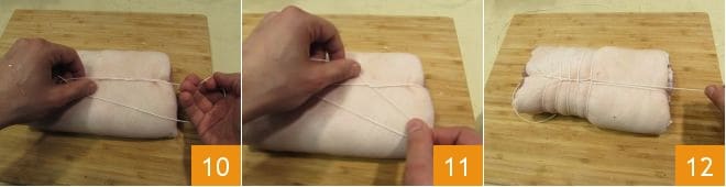 En este punto tendrás que Cómo atar el asado. Entonces envuelve el hilo a lo largo atando los extremos 10. Deja una parte del hilo más larga. Haz un primer nudo en una parte alta de uno de los dos extremos para fijar la base 11. Luego continúa repitiendo, de esta manera los varios nudos como un lazo mantendrán bien firme la corteza con la carne 12.