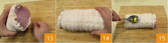 Finalmente haz una segunda vuelta alrededor del lomo con el hilo, pasándolo por la parte superior 13 y aprieta con un nudo 14. Espolvorea todo con un poco de aceite de oliva virgen extra 15