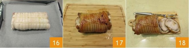 y coloca el asado en una bandeja de horno forrada con papel de horno 16, cocina en horno precalentado a 190° en modo estático durante 1 hora y media (se desaconseja la cocción en horno ventilado, la carne se secaría demasiado). Para estar seguros sobre la cocción, equípate con un termómetro para asados y haz que la punta llegue al corazón del lomo, cuya temperatura óptima deberá ser de 69°. Tu asado de cerdo en porchetta está listo 17 para ser desatado a medida que lo cortes 18! ¡Buen provecho!