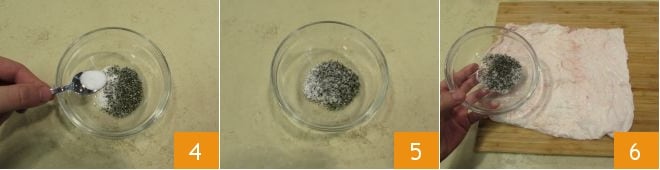 En un pequeño bol, vierte una pizca de sal 4 y mezcla con una cucharilla para amalgamar todo 5. Coloca la corteza en una tabla y espolvorea toda la superficie con sal y romero 6.