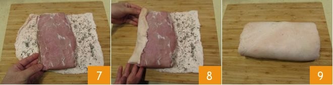 Coloca en el medio el lomo de cerdo 7 y envuélvelo cuidadosamente con la corteza 8 de modo que la pulpa quede completamente cubierta 9.