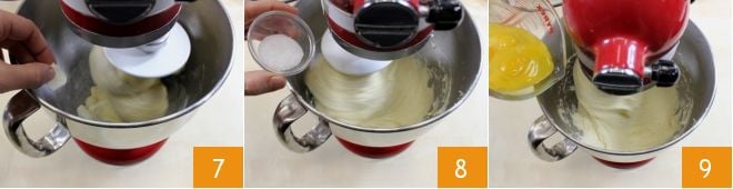 A continuación, añadid a la masa el azúcar y el queso pecorino rallado. En este punto, poned en marcha el gancho: la masa debe ser trabajada hasta que se enrolle alrededor del gancho. Luego podéis añadir la mantequilla ablandada en pequeñas porciones 7, incorporando una a la vez y esperando que se absorba la anterior antes de añadir la siguiente. Luego, verted también la sal 8, y luego los otros 4 huevos a temperatura ambiente, uno a uno (o poco a poco si los habéis batido) 9 y continuad trabajando la masa para incorporarlos.