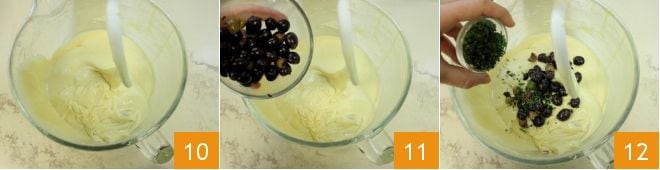 Debéis obtener una masa muy suave y elástica 10. Podéis parar el robot y añadir el relleno: las aceitunas de Gaeta 11, las hierbas aromáticas 12,