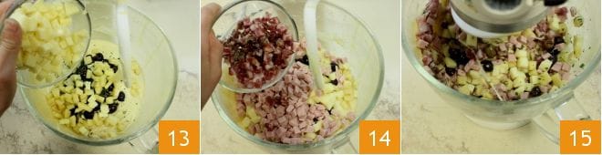 los quesos en dados 13, el jamón cocido y el salami 14. Encended nuevamente el robot para mezclar los ingredientes de manera homogénea con la masa 15.