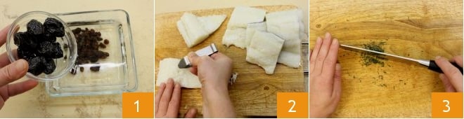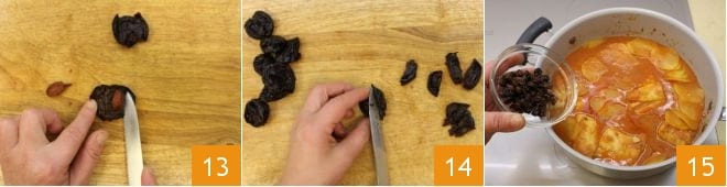 Cortad las ciruelas por la mitad para eliminar el hueso 13 y luego reducídlas a rodajas 14, después añadidlas al bacalao junto con las pasas 15