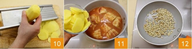 Pelad las patatas y cortadlas con una mandolina 10, deben tener un grosor de aproximadamente 2-3 mm, a medida que las cortáis, ponedlas en un cuenco con agua fría para que no se oscurezcan; luego añadidlas al bacalao y cocinad durante otros 30 minutos aproximadamente 11. Mientras tanto, en una sartén aparte, tostád los piñones 12.