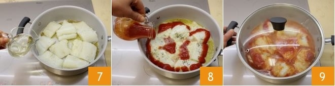 Añadid los filetes de bacalao, el tomillo picado, el vino blanco 7 y cocinad durante 5 minutos. Posteriormente, verted el puré de tomate 8 y mezclad con una cuchara de madera. Ajustad de sal y pimienta a vuestro gusto y tapad con la tapa 9, continuando la cocción a fuego moderado durante otros 20 minutos.