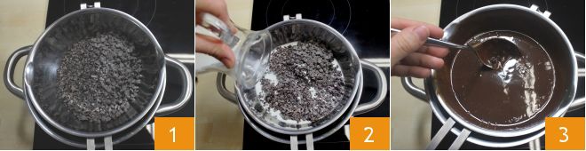 Para preparar la bavareisa, derrite el chocolate negro (en pastillas o troceado) al baño maría 1 y mézclalo junto con la leche y la nata 2. Deja que se derrita bien para obtener un chocolate sin grumos y de consistencia cremosa 3. Una vez listo, mantenlo aparte en caliente.