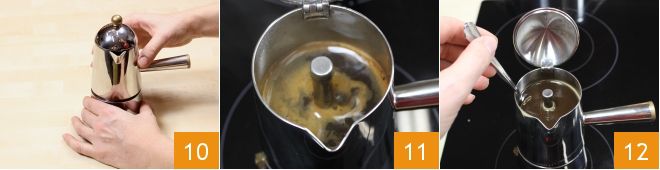 Cierra la cafetera muy apretada 10, para que el café no se derrame por los lados mientras sube, y colócala sobre una llama baja y constante para obtener un café con cuerpo. A medida que sube el café, se formará una espuma densa 11: te recomendamos no dejar burbujear demasiado tiempo el café para mantener intacta su dulzura y aroma. Tu café está listo: antes de utilizarlo, mézclalo directamente en la moka con una cucharilla para hacer el café más homogéneo 12.