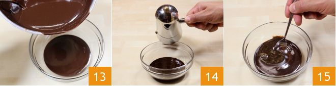 Cuando el café esté listo, por cada taza, vierte en un bol 80 gr de chocolate todavía caliente 13 y añade 50 gr de café 14, aproximadamente una taza, y mezcla para integrar bien los ingredientes 15.