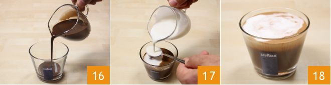 Vierte en un vaso mediano el compuesto bien caliente 16 y completa con el topping de nata, que debe estar muy frío, recién sacado de la nevera: vierte unos 20 ml sobre el chocolate, ayudándote con una cucharilla para que el topping se pose sobre el café, porque debe formar una capa y no mezclarse con el chocolate 17. No mezcles la bavareisa, bébela así 18: ¡verás qué buena está!
