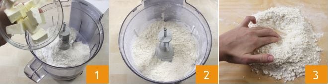 Para preparar los befanini, comienza poniendo la harina y la mantequilla, bien fría, dentro de un procesador de alimentos 1. Acciona el aparato y mezcla hasta obtener una consistencia arenosa 2 que luego transferirás a una superficie de trabajo, formando un volcán con un hueco en el centro 3.