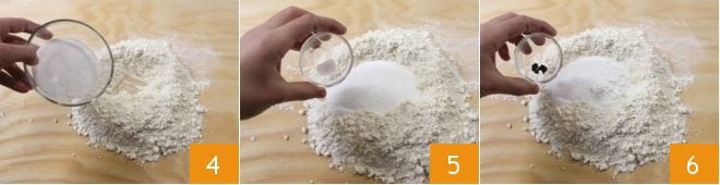 Añade ahora el azúcar 4, la levadura 5, las semillas de la vaina de vainilla 6,