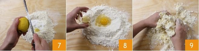 la ralladura de limón 7, el huevo y finalmente el ron 8. Amasa todo con las manos 9 hasta obtener una masa lisa y compacta,