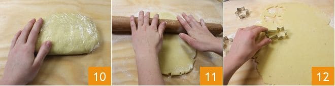 a la que le darás forma de bloque, aplánalo un poco con las manos, cúbrelo con film transparente 10 y ponlo en el frigorífico a reposar al menos una hora. Pasado este tiempo, extiende la masa con la ayuda de un rodillo 11 hasta obtener una lámina delgada (aproximadamente 3 mm), luego corta las galletas con cortadores navideños 12.