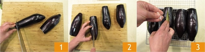 Para preparar las berenjenas 'mbuttunate, primero lavad las berenjenas y eliminad el pedúnculo 1. Haced incisiones en las berenjenas a lo largo 2, teniendo cuidado de no cortar la base. Bastarán 5-6 cortes para berenjenas de unos 200 g cada una. En las incisiones, debéis insertar una pizca de sal gruesa 3.