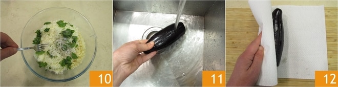 Mezclad bien 10. Cuando las berenjenas hayan perdido el líquido, enjuagadlas bien bajo el agua para quitar la sal 11. Secadlas bien con papel de cocina 12.