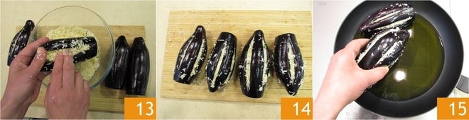 Ahora solo queda rellenar las berenjenas en las incisiones 13 14. En una sartén muy grande (deben caber todas las 4) verted el aceite de girasol, calentadlo un minuto, luego añadid las berenjenas con cuidado de no quemaros 15.