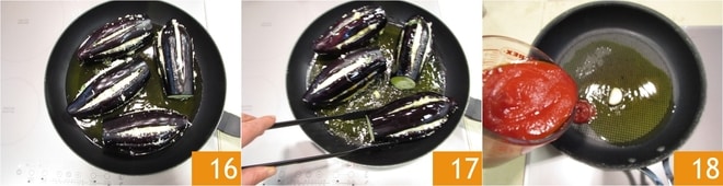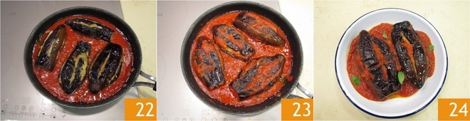 Pasad las berenjenas a la salsa 22. Cocinad durante unos 25-30 minutos, girándolas con cuidado al menos 2-3 veces. Una vez cocidas 23, servidlas bien calientes 24.