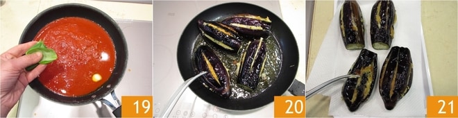 Ajustad de sal, añadid las hojas de albahaca 19 y cocinad durante unos 10 minutos. Pasados los 10 minutos, escurrid las berenjenas 20 y transferidlas a papel absorbente 21.