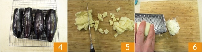 Dejad escurrir en una rejilla, con un recipiente debajo, durante unas 2-3 horas 4. Mientras tanto, preparad el relleno. Cortad la miga de pan en cubos 5 y rallad el Caciocavallo 6, el Pecorino y el Parmigiano.