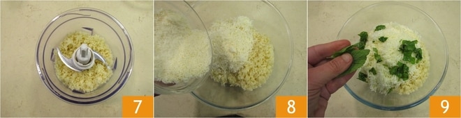 Triturad la miga de pan en un procesador de alimentos 7 y transferidla a un bol. Añadid los quesos 8, las hojas de menta y de albahaca 9.