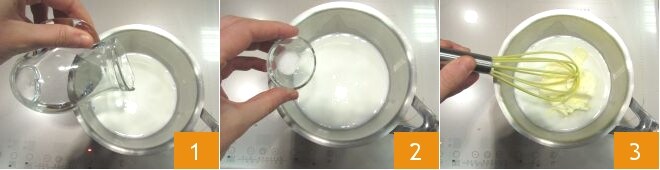 Para preparar los bignés con crema pastelera de parmesano y lima, comienza ocupándote de la pasta choux. Pon en un cazo la leche, el agua 1, la sal, el azúcar 2 y la mantequilla 3. Deja que se derrita a fuego lento y lleva a ebullición,