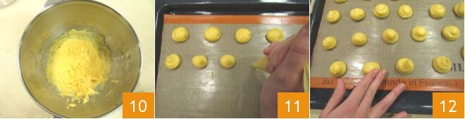 Continúa batiendo unos minutos, hasta obtener una masa lisa y uniforme 10. Transfiérela a una manga pastelera y forma tus bignés sobre una bandeja forrada con un tapete de silicona (o papel de horno), asegurándote de dejarlos bien espaciados entre sí 11. Deberías obtener unos 20 bignés. Baja las puntas de los bignés ejerciendo una ligera presión con la punta de los dedos humedecidos 12, luego procede con la cocción en horno estático precalentado a 200° durante 25 minutos.