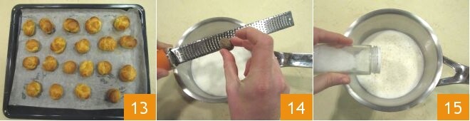 Presta atención a no abrir la puerta del horno durante la cocción y, una vez listos, deja enfriar tus bignés dentro del horno manteniendo la puerta entreabierta 13. Mientras tanto, ocúpate de la crema: pon la leche en un cazo y aromatízala con la nuez moscada 14, la sal 15