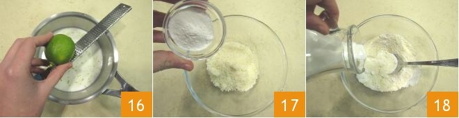 Y la cáscara de lima 16. Calienta a fuego bajo hasta llevarla a ebullición. Mientras tanto, en un bol mezcla el parmesano y el almidón 17 y añade también la nata 18.