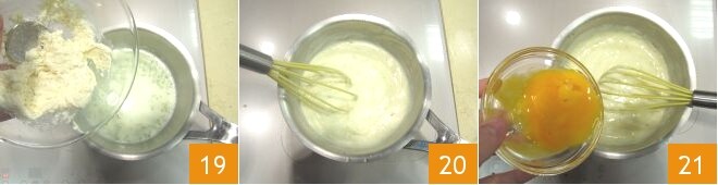 Mezcla la preparación y agrégala a la leche ya hirviendo 19. Sin dejar de mezclar con unas varillas, deja espesar la crema durante unos minutos 20. Luego añade las yemas 21,
