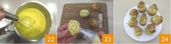mezcla inmediatamente y continúa amalgamando durante un minuto, hasta que la crema esté perfectamente espesa 22. Déjala enfriar, cubierta con film en contacto, luego colócala en una manga pastelera con boquilla de estrella. Corta por la mitad los bignés y rellénalos con la crema 23, y finalmente completa con una ralladura de cáscara de lima. ¡Tus bignés con crema pastelera de parmesano y lima están listos para ser disfrutados 24!