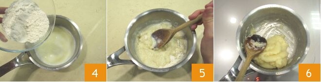 luego retira un momento del fuego y añade la harina 4, mezclando inmediatamente para evitar la formación de grumos 5. Vuelve a poner el cazo al fuego y cocina la mezcla hasta que esté bien lisa y, en el fondo del cazo, aparezca una película 6.