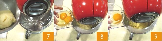 Transfiere la mezcla a la batidora 7. Activa la batidora de varillas y deja trabajar durante un par de minutos para enfriar la mezcla. Con la batidora en acción, añade los huevos 8 uno a uno, agregando el siguiente solo cuando el anterior se haya absorbido perfectamente 9.