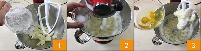 Para preparar las galletas arlequín, montad, con una batidora equipada con pala o con las varillas de una batidora eléctrica, la mantequilla blanda a temperatura ambiente con el azúcar glas 1, hasta obtener una mezcla espumosa. Añadid la sal 2 y los huevos 3 y luego mezclad hasta que todos los ingredientes estén bien integrados.