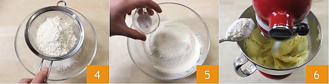 Tamiza la harina 4 y añade el bicarbonato 5 junto con ella al compuesto, una cucharada a la vez 6, continuando a mezclar, hasta que los polvos estén bien incorporados al compuesto.