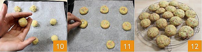 Modela cada montón en forma esférica 10 y aplánalos ligeramente, luego coloca, sobre cada galleta, algunas virutas de colores sobrantes 11. Hornea, en horno estático ya caliente a 180° por 10 minutos (horno ventilado 160° por 7-8 minutos), o hasta que las galletas estén doradas en los bordes. Sácalas del horno y déjalas enfriar sobre una rejilla 12: ¡aquí están listas las alegres galletas arlequín!