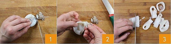 Para preparar el brodetto fanese, empiecen primero con la limpieza de los pescados. Limpien las sepias separando la cabeza del cuerpo 1, eviscerándolas 2 y si son pequeñas déjenlas así, de lo contrario córtenlas en trozos. Limpien de la misma manera el calamar y corten el cuerpo en rodajas 3.