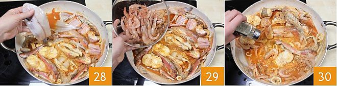 los lenguados 28 y por último los camarones 29. Dejen cocer durante 10 minutos como máximo, luego sal, pimienta 30 ¡y voilà, el brodetto fanese está listo! Sírvanlo con costrones de pan tostado en el horno o bien con rebanadas de pan fresco!