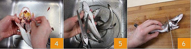 Mantengan entera la gallineta y eviscéranla bajo el agua corriente 4; Hagan lo mismo con la merluza: abran el vientre y eviscéranla 5. Luego eliminen la cabeza 6; si es muy grande, cortenla en trozos, de lo contrario déjenla entera.