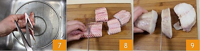 Evisceren también las caballas y déjenlas enteras 7. Ahora corten en trozos tanto el espinarolo como el rape, a los que ya les han quitado la piel, que se encuentran ya limpios en el mercado (8-9).