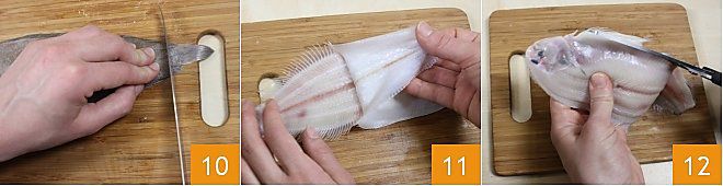 Limpien el lenguado: hagan una incisión en la piel desde la cola con un cuchillo 10 y tírenla con fuerza 11 de ambos lados. Con las tijeras, eliminen las espinas externas 12. Para más detalles, vean la Escuela de Cocina: limpiar el lenguado.