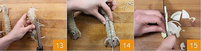Finalmente, ocupense de los crustáceos: eliminen las patitas de las galeras y háganles una incisión en el centro desde la cabeza (13-14). Hagan lo mismo con los langostinos si quieren, así será más fácil consumirlos una vez cocidos. A este punto, procedan con el brodetto: piquen la cebolla 15 y