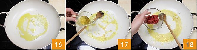 déjenla pochar en abundante aceite con un diente de ajo, que podrán dejar entero o aplastado 16, a fuego muy bajo durante 15 minutos. Desglasen con el vinagre de vino blanco (u otro vinagre, lo importante es que sea delicado) 17 y, una vez que el vinagre se haya evaporado, añadan el concentrado de tomate 18.
