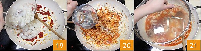 Ahora que el fondo está listo, pueden añadir los pescados, empezando por aquellos con cocción más larga: las sepias y los calamares 19 que deben sofreír durante unos 10 minutos. Entonces añadan el agua caliente 20 (o Caldo de pescado o Caldo de mariscos si disponen de ello) y cubran con una tapa 21.