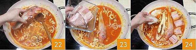 Ahora unan en la cacerola los pescados principales: la gallineta 22, el espinarolo 23, el rape 24 y finalmente la merluza. No mezclen más con una cuchara de madera de ahora en adelante, sino solo sacudan la cacerola por los mangos.