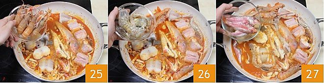 Finalmente, añadan los crustáceos y las caballas, que requieren poca cocción: los langostinos 25, las galeras 26 y las caballas enteras 27,