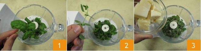 Para preparar las bruschetas con pesto de hierbas y sardinas a la parrilla comenzad preparando el pesto rápido. En el procesador de alimentos verted las hojas de albahaca 1, algunas hojas de melisa y algunas de orégano 2, luego sal, pimienta y el parmesano en trozos grandes 3