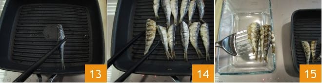 Retomad las sardinas sazonadas y colocadlas en la parrilla aún caliente 13. Coced también estas durante un par de minutos por lado, volteándolas cuando la piel tienda a despegarse de la parrilla 14. Una vez cocidas, transferidlas también a un recipiente 15.